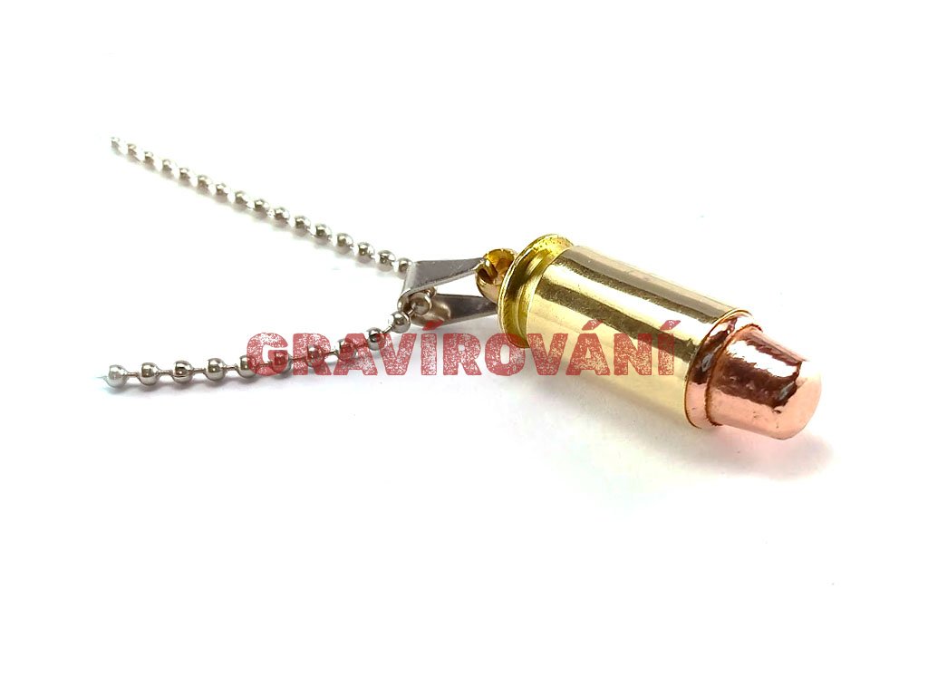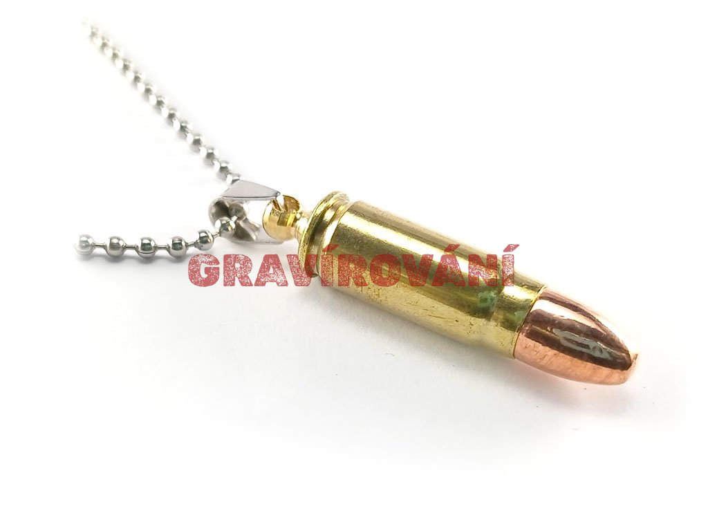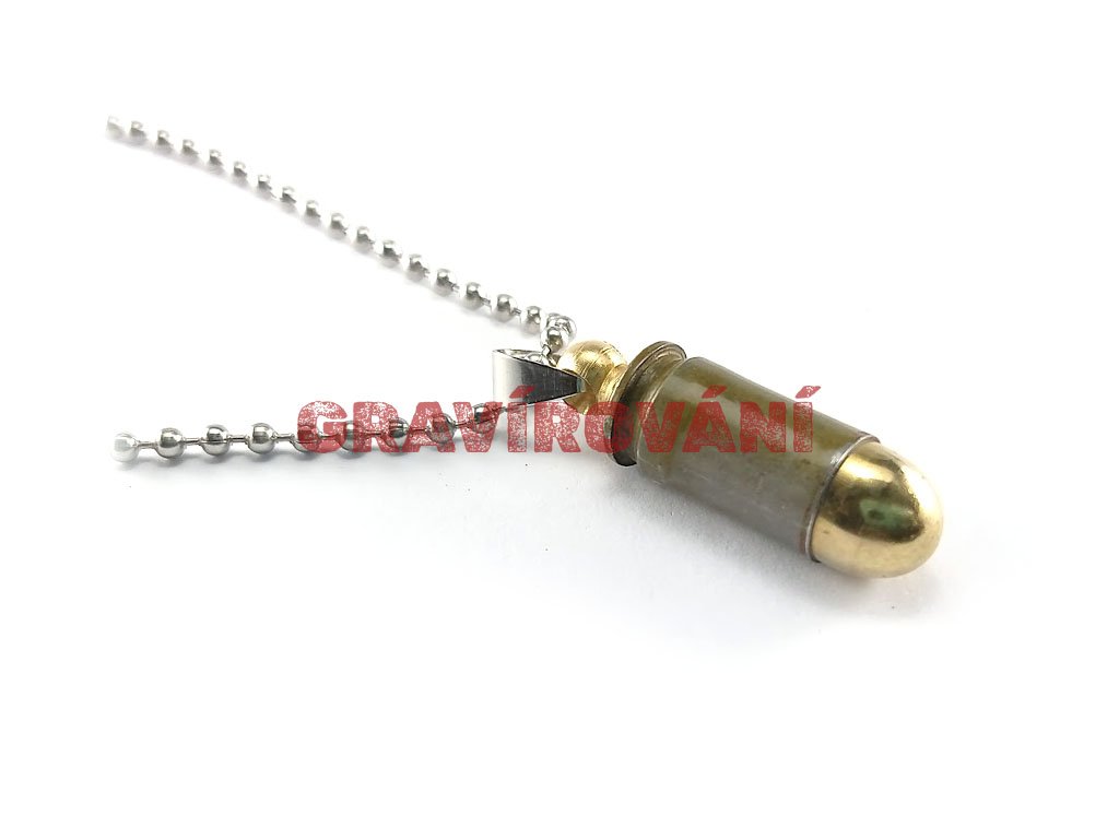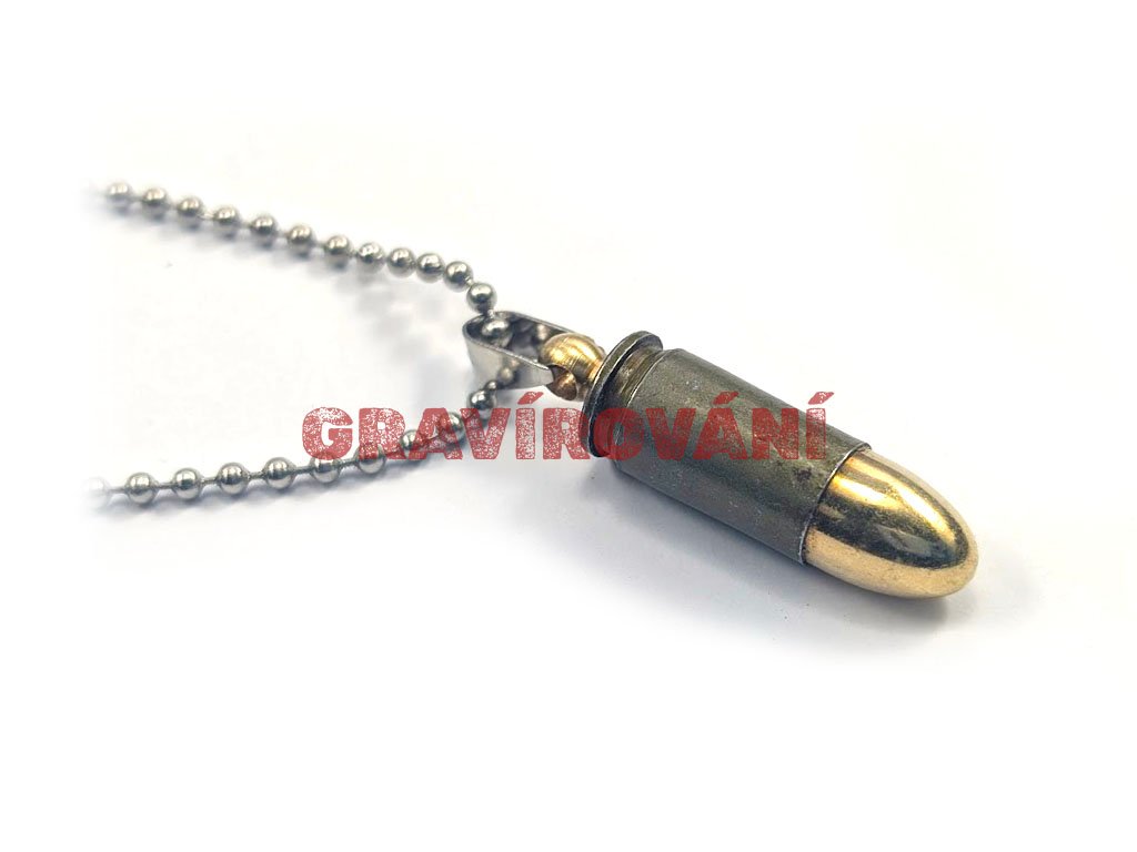 Náhrdelník vyrobený z pistolového náboje s laserovým gravírováním na přání zákazníka