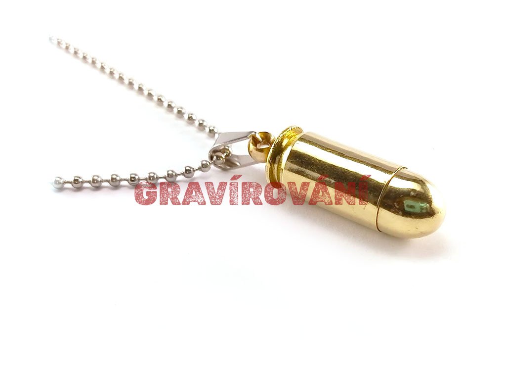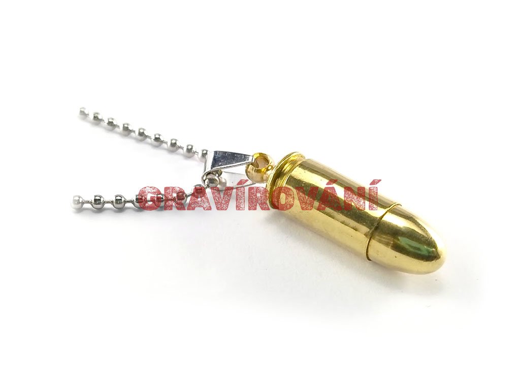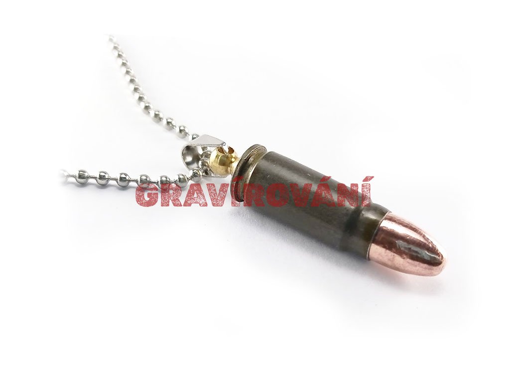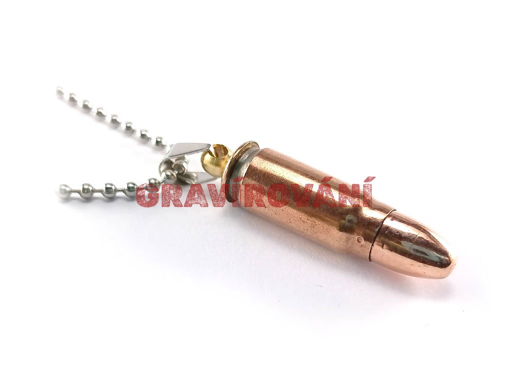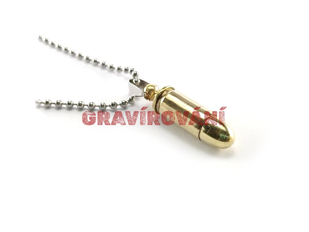 Náhrdelník vyrobený z pistolového náboje s laserovým gravírováním na přání zákazníka