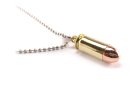 Náhrdelník na krk vyrobený z náboje 9x21 Italiano s mosaznou nábojnicí a FMJ střelou v barvě mosazi na nerezovém řetízku